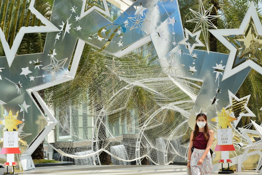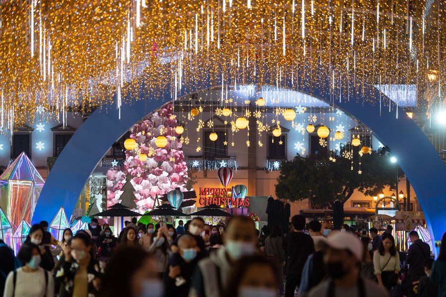 People walk past Christmas decorations at the Senado Square in south China's Macao, on Dec. 24, 2021. (Xinhua/Cheong Kam Ka)