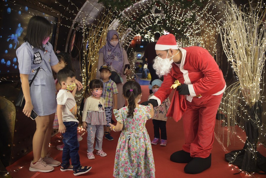 A staff member dressed as Santa Claus gives candies to children at Jakarta Aquarium & Safari in Jakarta, Indonesia, Dec. 20, 2021. (Xinhua/Zulkarnain)