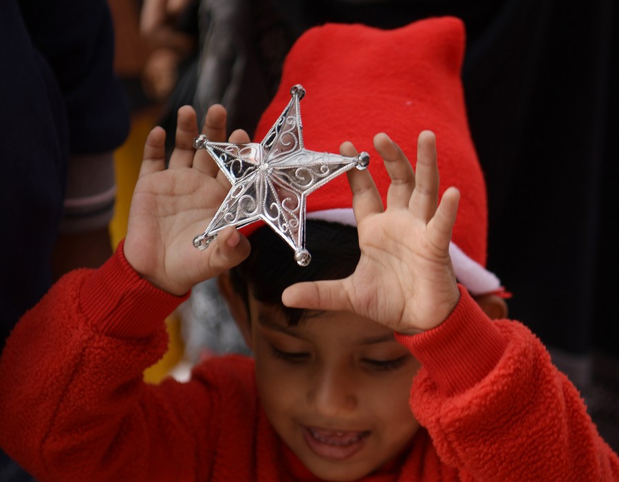 A boy holds a Christmas decoration at a market in Agartala, the capital city of India's northeastern state of Tripura, Dec. 24, 2021. (Str/Xinhua)