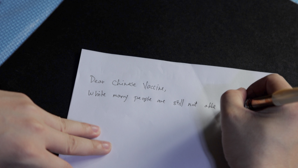 Screenshot shows Melvin Chua writing a letter to Chinese vaccine. (Xinhua)