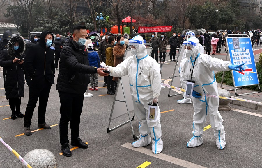 Residents queue up for nucleic acid test in Xi'an, northwest China's Shaanxi Province, Dec. 23, 2021. Xi'an imposed a citywide lockdown, effective Thursday, in an effort to curb the spread of the latest COVID-19 resurgence. (Xinhua/Liu Xiao)