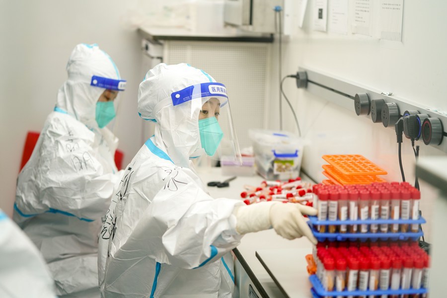 Liu Bing (R) tests nucleic acid samples at a nucleic acid test laboratory named Huoyan, or Fire Eye, in Heihe City, northeast China's Heilongjiang Province, Nov. 15, 2021. (Xinhua/Wang Song)