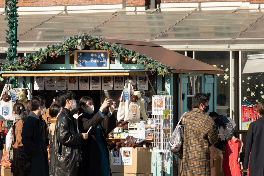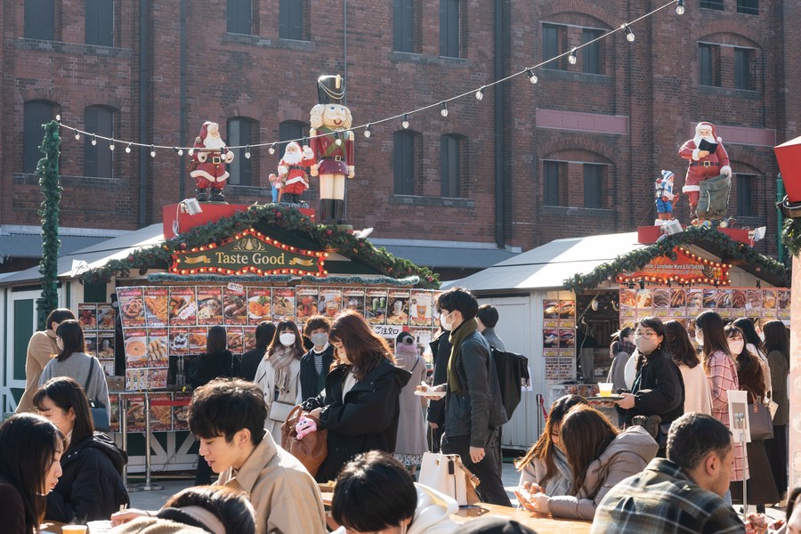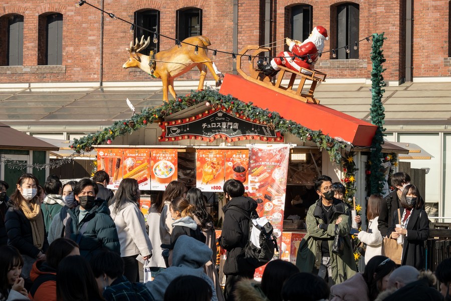 People visit the Christmas market at Yokohama Red Brick Warehouse in Yokohama, Japan, Dec. 24, 2021. (Photo by Sun Jialin/Xinhua)