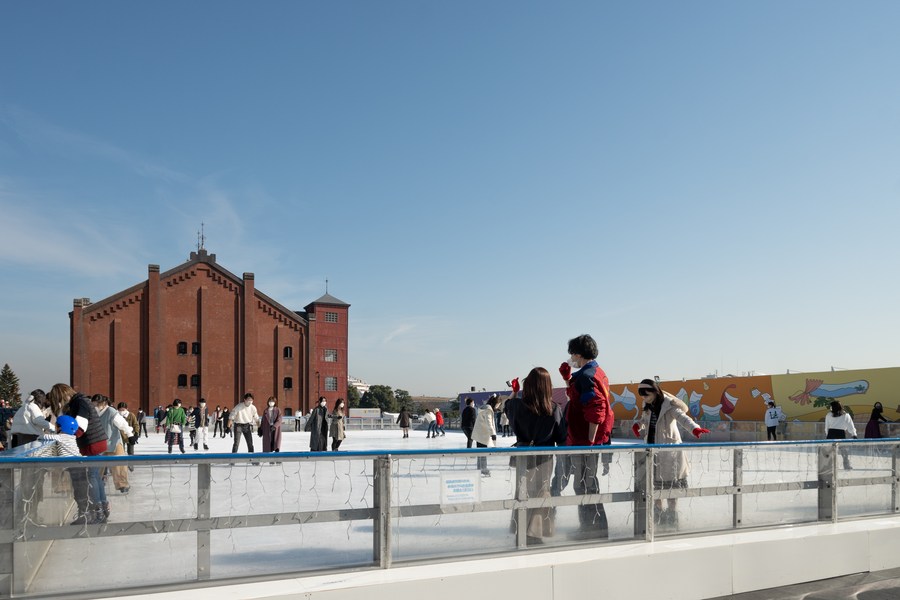 People ski near Yokohama Red Brick Warehouse in Yokohama, Japan, Dec. 24, 2021. (Photo by Sun Jialin/Xinhua) ■