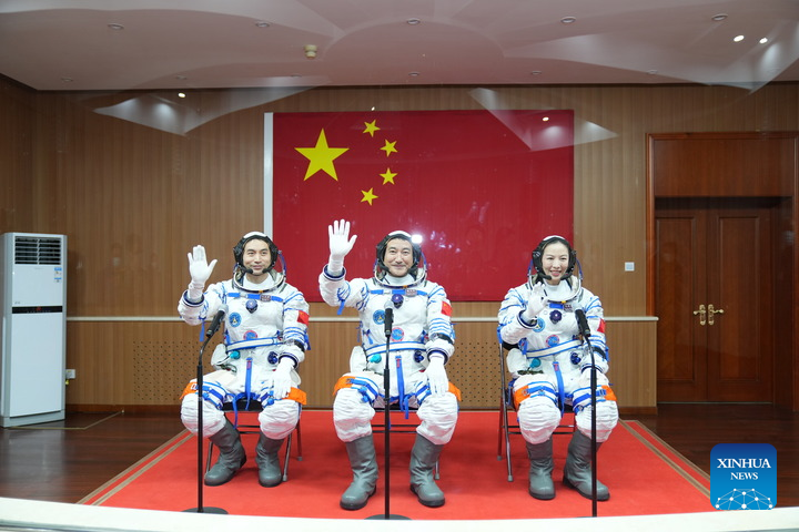 A see-off ceremony for three Chinese astronauts of the Shenzhou-13 crewed space mission is held at the Jiuquan Satellite Launch Center in northwest China, Oct. 15, 2021. Chinese astronauts Zhai Zhigang (C), Wang Yaping (R) and Ye Guangfu will stay in space for about six months. (Xinhua/Li Gang)