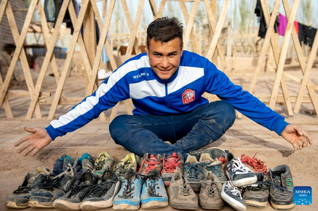 Nurmemet Sherep shows his worn football boots at his yard in Shufu County of Kashgar Prefecture, northwest China's Xinjiang Uygur Autonomous Region, Nov. 13, 2021. (Xinhua/Ma Kai)