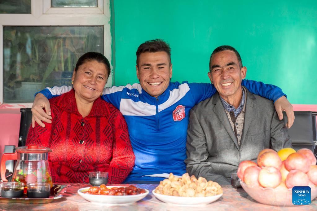Nurmemet Sherep poses for a photo with his parents at his home in Shufu County of Kashgar Prefecture, northwest China's Xinjiang Uygur Autonomous Region, Nov. 13, 2021. (Xinhua/Ma Kai)