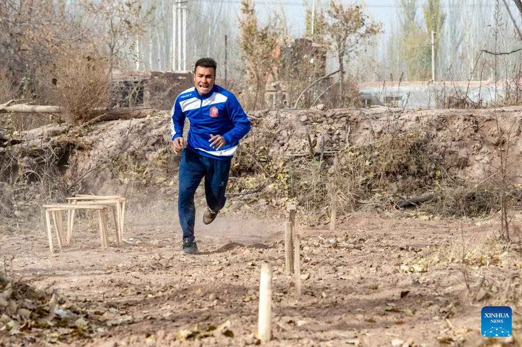 Nurmemet Sherep trains himself at a cornfield in Shufu County of Kashgar Prefecture, northwest China's Xinjiang Uygur Autonomous Region, Nov. 13, 2021. (Xinhua/Ma Kai)