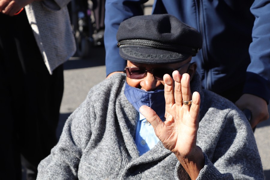 Nobel Peace Prize laureate Emeritus Archbishop Desmond Tutu waves to people after receiving the COVID-19 vaccine in Cape Town, South Africa, on May 17, 2021. (Western Cape government/Handout via Xinhua)