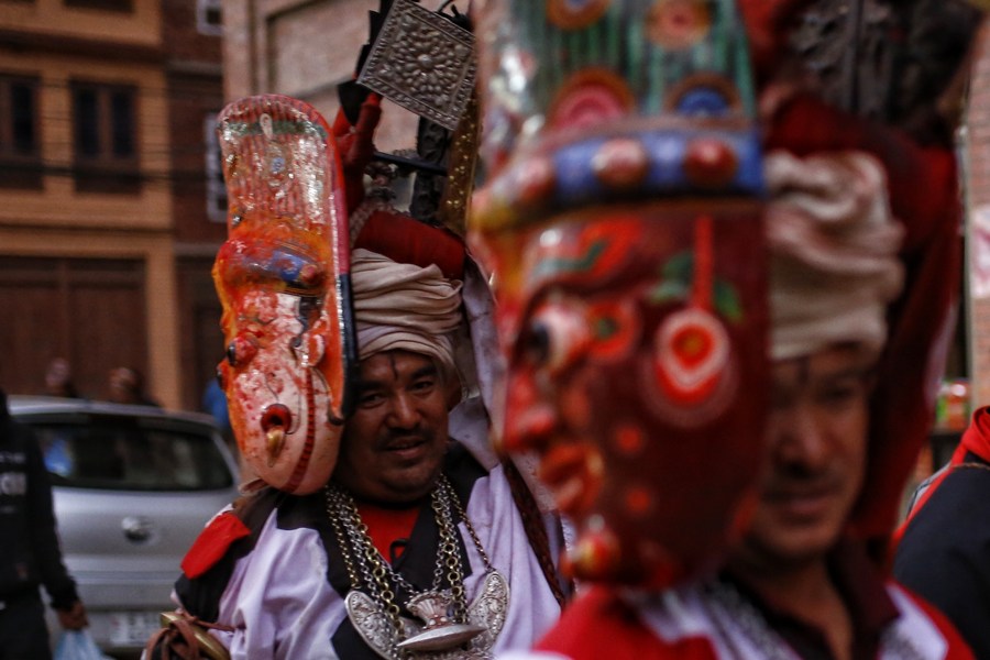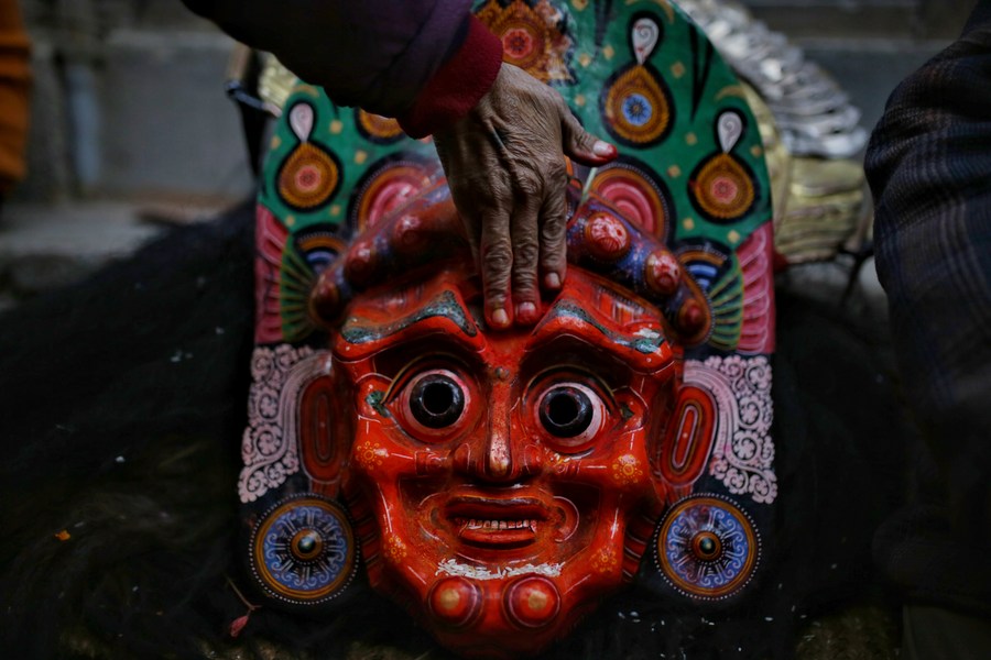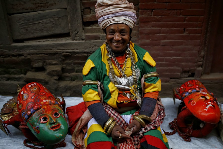 A man with masks are seen during the Navadurga Festival in Bhaktapur, Nepal, on Dec. 25, 2021. (Photo by Sulav Shrestha/Xinhua)