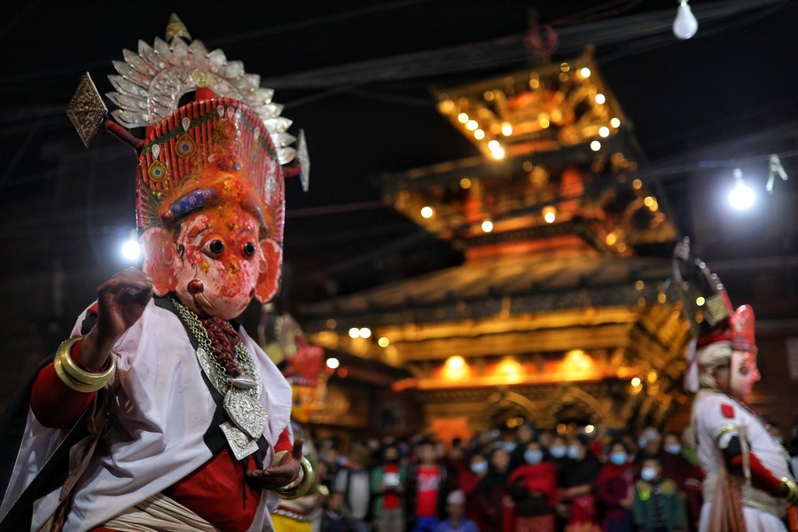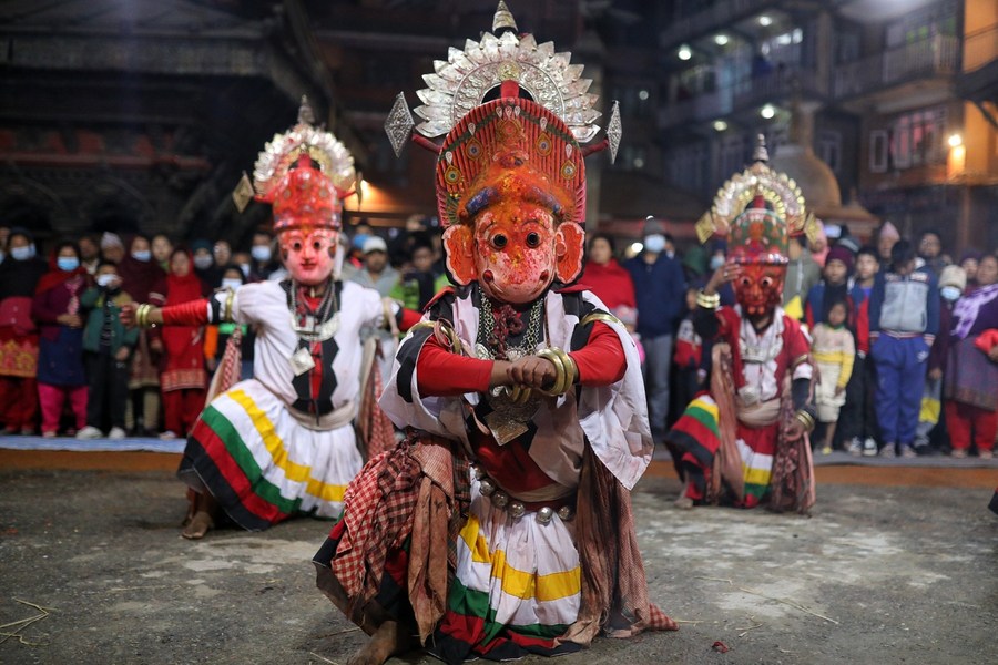 Masked men perform during the Navadurga Festival in Bhaktapur, Nepal, on Dec. 25, 2021. (Photo by Sulav Shrestha/Xinhua)
