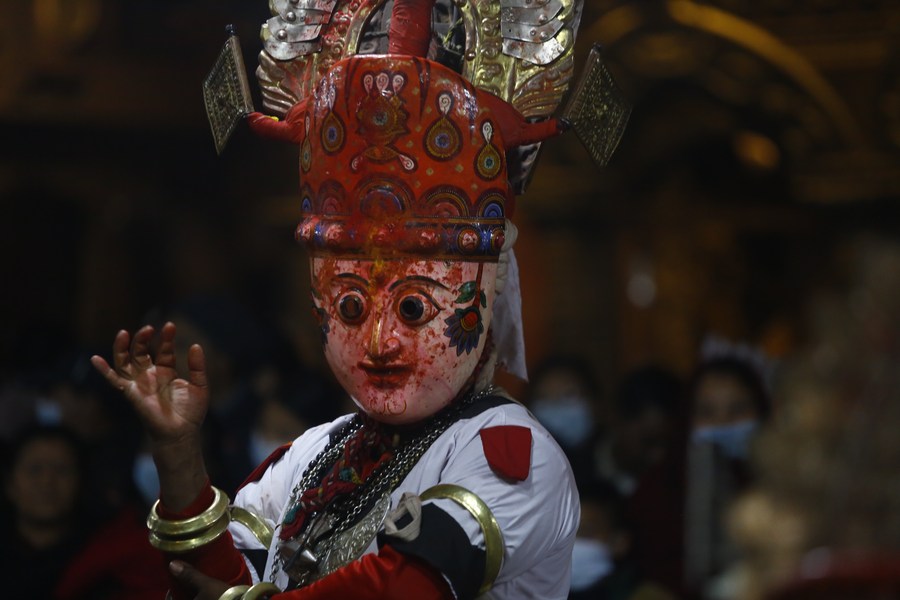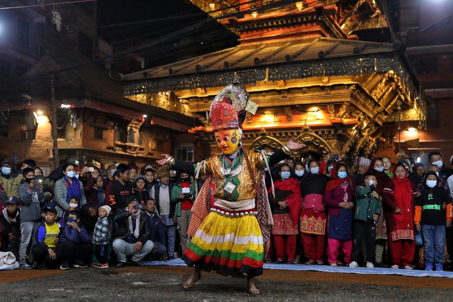 A masked man performs during the Navadurga Festival in Bhaktapur, Nepal, on Dec. 25, 2021. (Photo by Sulav Shrestha/Xinhua)