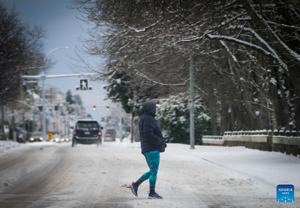 A person walks across a snow-covered street in Vancouver, British Columbia, Canada, on Dec. 26, 2021. Environmental Canada issued an extreme cold and Arctic outflow warning throughout most of British Columbia this holiday weekend, as wind chill values could dip below -20 degrees Celsius on Sunday. (Photo by Liang Sen/Xinhua)
