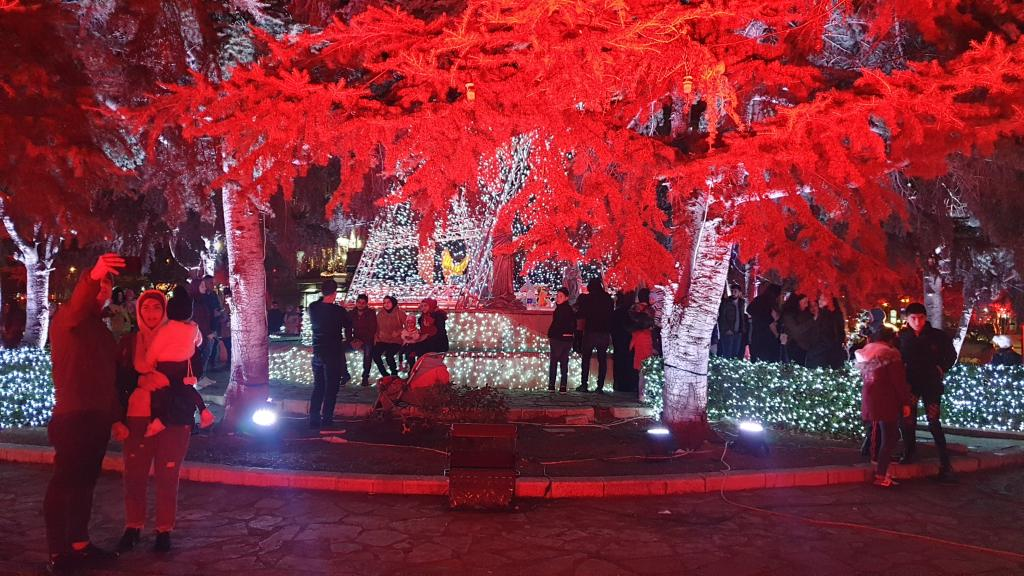Photo taken on Dec. 25, 2021 shows light decorations of the Christmas village in Zahle, eastern Lebanon. (Photo by Taher Abu Hamdan/Xinhua)