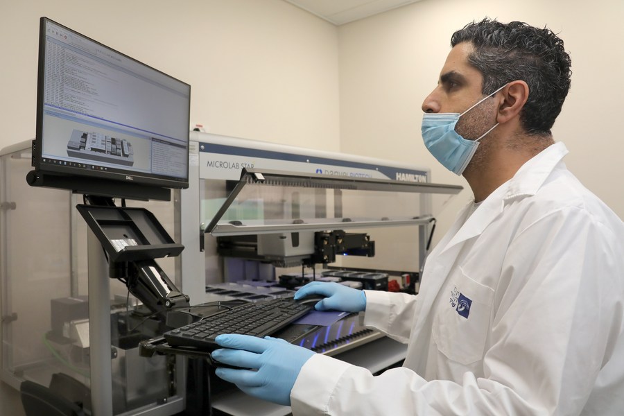 A medical worker tests samples to detect the new COVID-19 variant Omicron in a lab at the Shamir Medical Center near Tel Aviv, Israel, on Dec. 1, 2021. (Gideon Markowicz/JINI via Xinhua)
