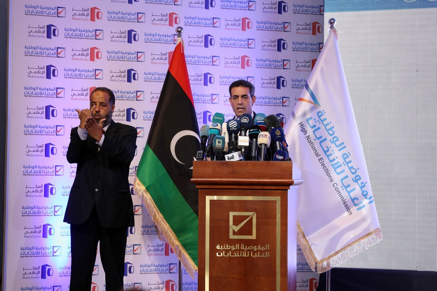 Emad Al-Sayeh (R), Chairman of the High National Elections Commission, makes an announcement of presidential candidacy during a press conference in Tripoli, Libya, on Nov. 23, 2021. (Photo by Hamza Turkia/Xinhua)