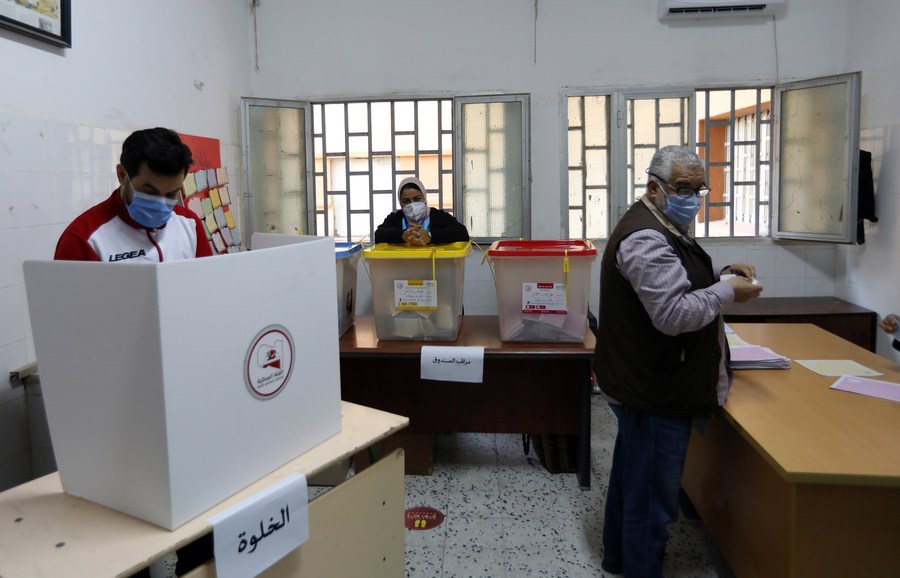 Election workers are seen at a polling station in Tripoli, Libya, on Feb. 6, 2021. (Photo by Hamza Turkia/Xinhua)