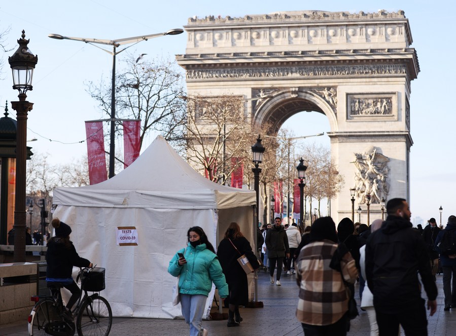 People walk near a fast COVID-19 testing tent near the Arc de Triomphe in Paris, France, Dec. 23, 2021. (Xinhua/Gao Jing)