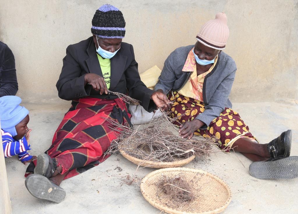 At their workstation, two elderly women sorted dried plant roots from traditional handmade weaved baskets. Another woman effortlessly pounded some baobab fruit seeds using traditional handcrafted wooden mortar and pestle.