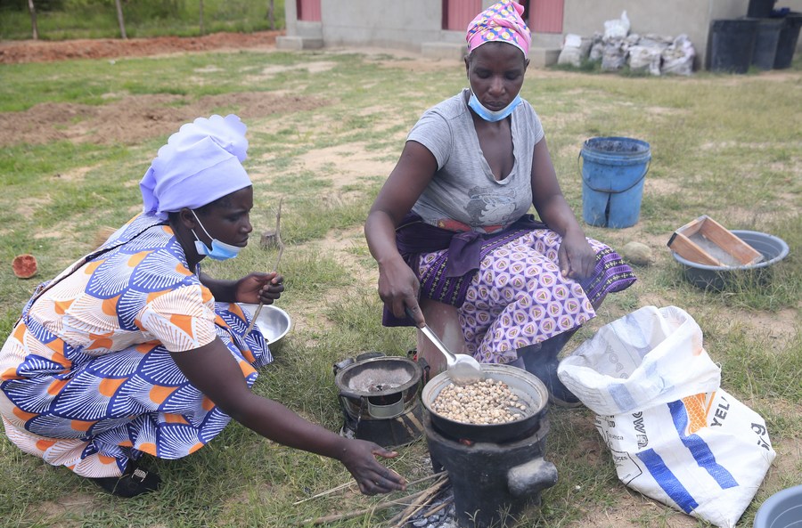Members of the Women's Farming Syndicate (WFS) roast baobab fruit seeds in Domboshava, Mashonaland East Province, Zimbabwe, on Dec. 21, 2021. (Xinhua/Shaun Jusa)