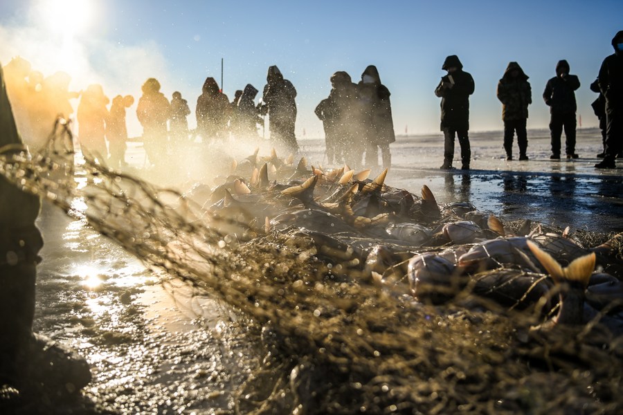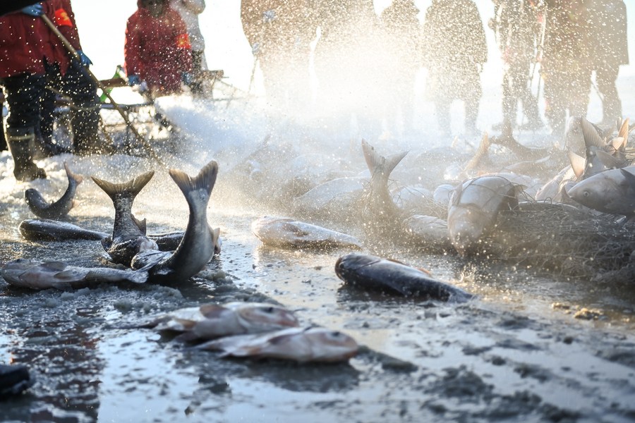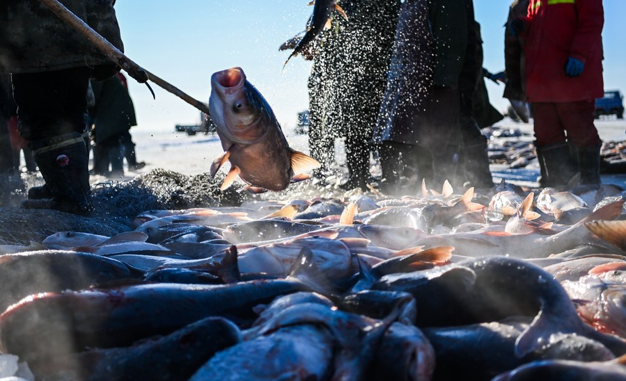 Newly-caught fish are seen on the Chagan Lake in Songyuan City, northeast China's Jilin Province, Dec. 26, 2021. (Xinhua/Yan Linyun)