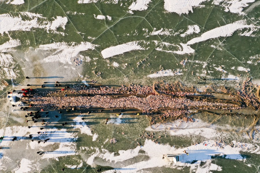 Fishermen harvest fish on the Chagan Lake in Songyuan City, northeast China's Jilin Province, Dec. 26, 2021. (Xinhua/Yan Linyun)