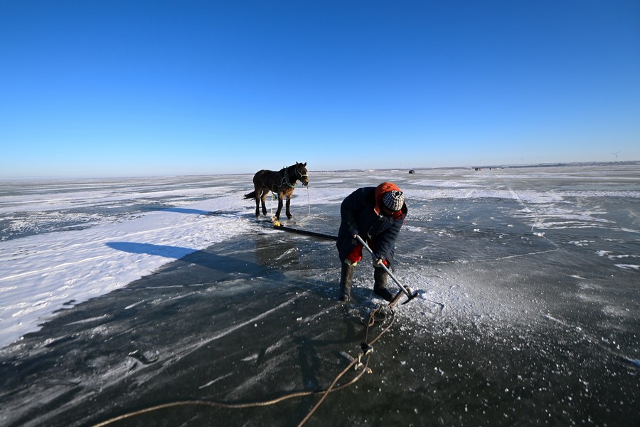 A fisherman prepares to harvest fish on the Chagan Lake in Songyuan City, northeast China's Jilin Province, Dec. 26, 2021. (Xinhua/Yan Linyun)