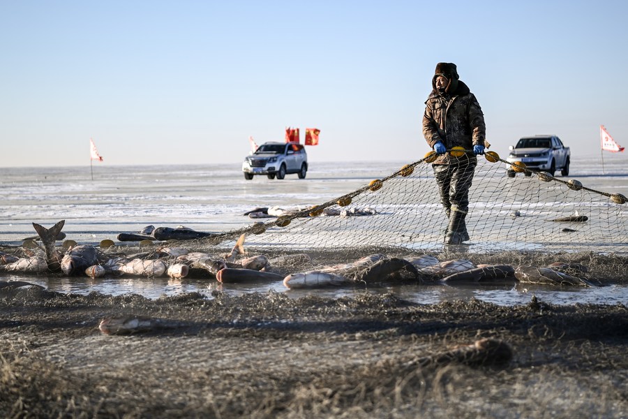 A fisherman harvests fish on the Chagan Lake in Songyuan City, northeast China's Jilin Province, Dec. 26, 2021. (Xinhua/Yan Linyun)