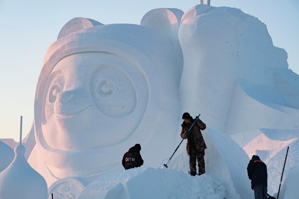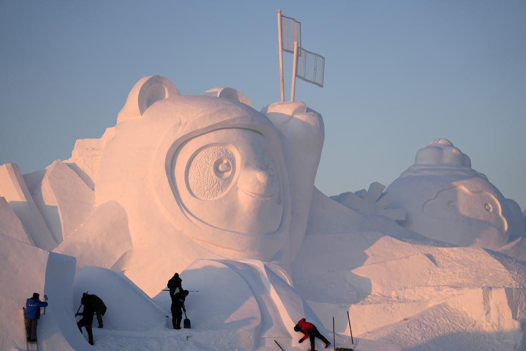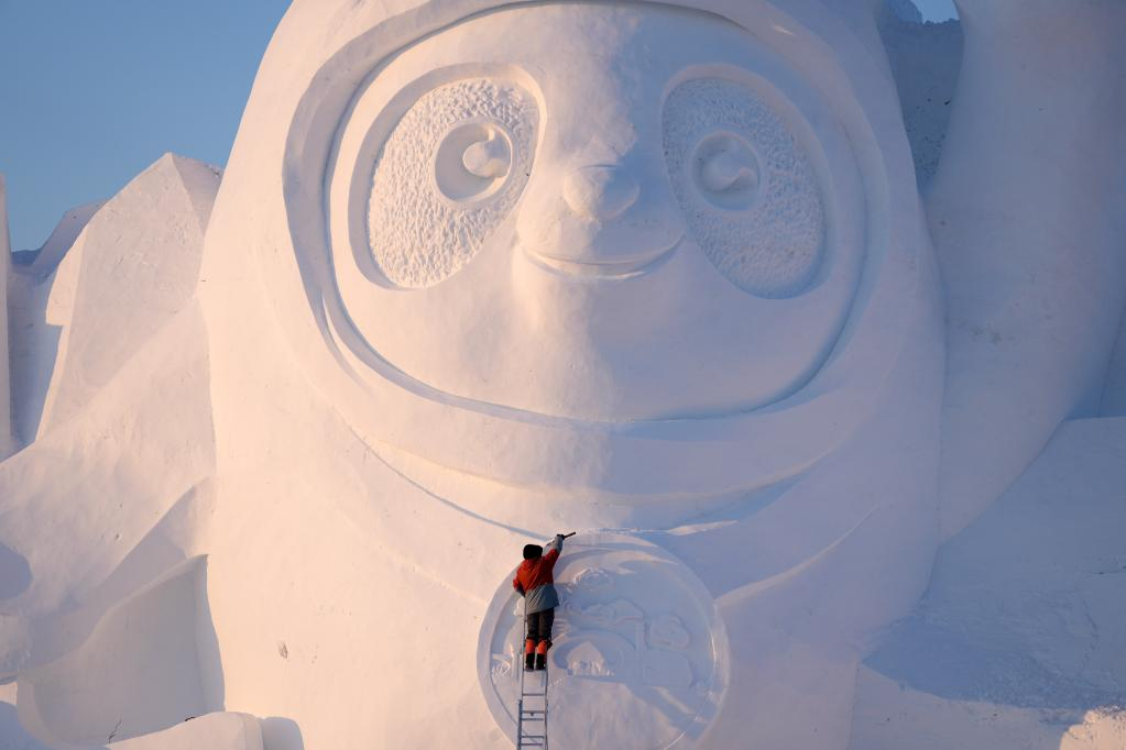 A worker finishes the main snow sculpture featuring Beijing 2022 mascots at the 34th Harbin Sun Island International Snow Sculpture Art Exposition in Harbin, northeast China's Heilongjiang Province, Dec. 27, 2021. (Xinhua/Wang Jianwei)