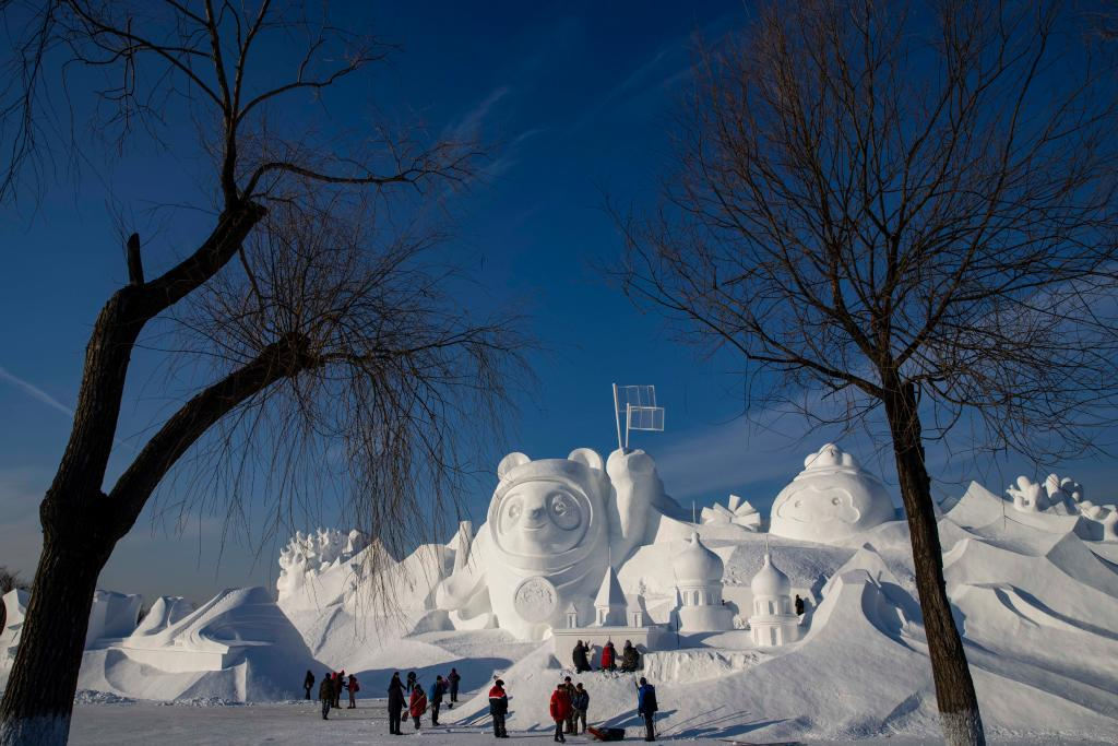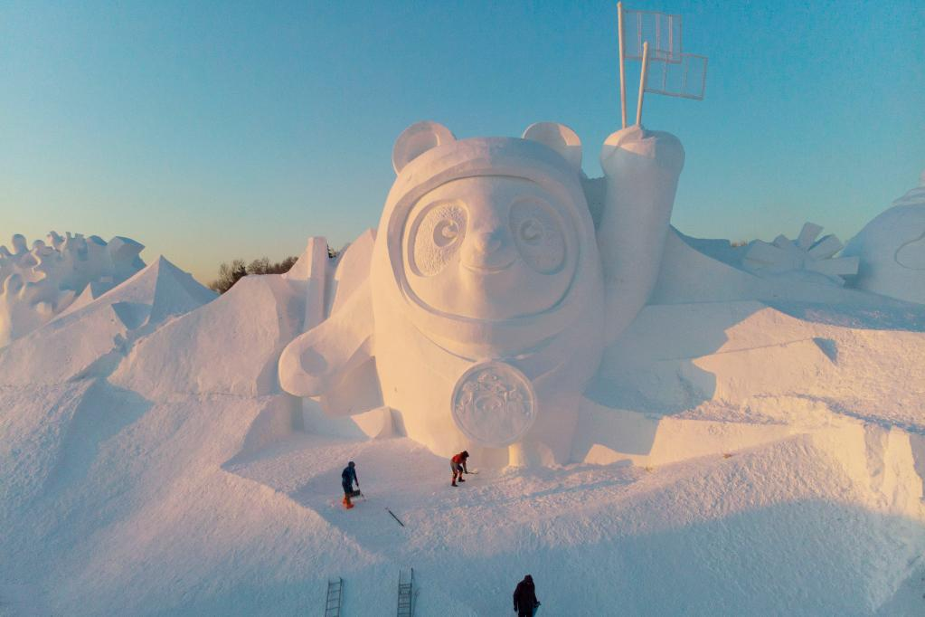 Workers finish the main snow sculpture featuring Beijing 2022 mascots at the 34th Harbin Sun Island International Snow Sculpture Art Exposition in Harbin, northeast China's Heilongjiang Province, Dec. 28, 2021. (Xinhua/Zhang Tao)