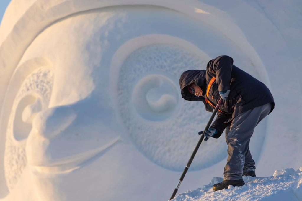 A worker finishes the main snow sculpture featuring Beijing 2022 mascots at the 34th Harbin Sun Island International Snow Sculpture Art Exposition in Harbin, northeast China's Heilongjiang Province, Dec. 27, 2021. (Xinhua/Zhang Tao)