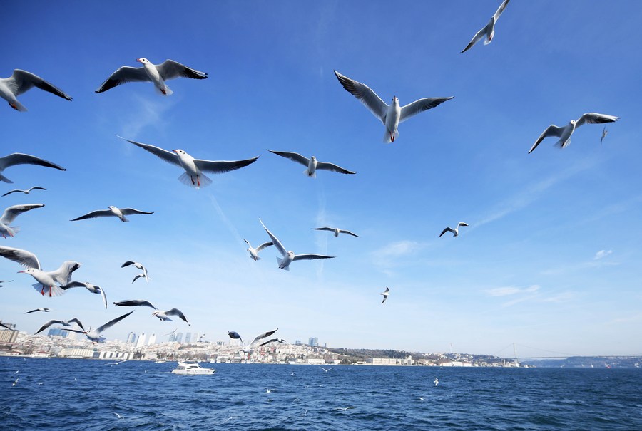 Seagulls feed on the water of the Bosphorus Strait in Istanbul, Turkey, Dec. 26, 2021. (Xinhua/Shadati)