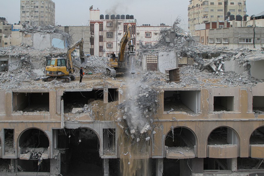 Palestinian workers remove the rubble of al-Jawhara Tower which was targeted by Israeli air strikes in Gaza City, on Dec. 13, 2021. (Photo by Rizek Abdeljawad/Xinhua)