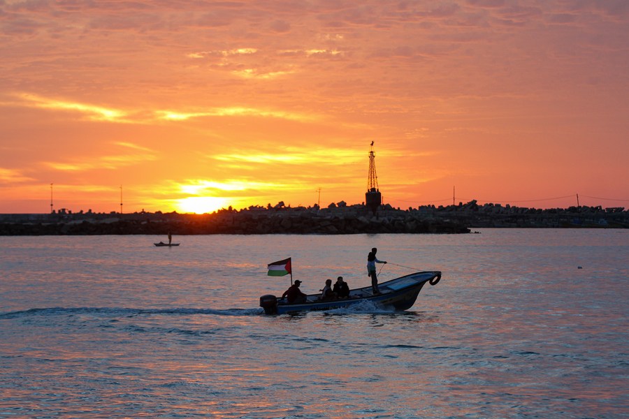 Palestinian fishermen go fishing in Gaza City, on Dec. 4, 2021. (Photo by Rizek Abdeljawad/Xinhua)
