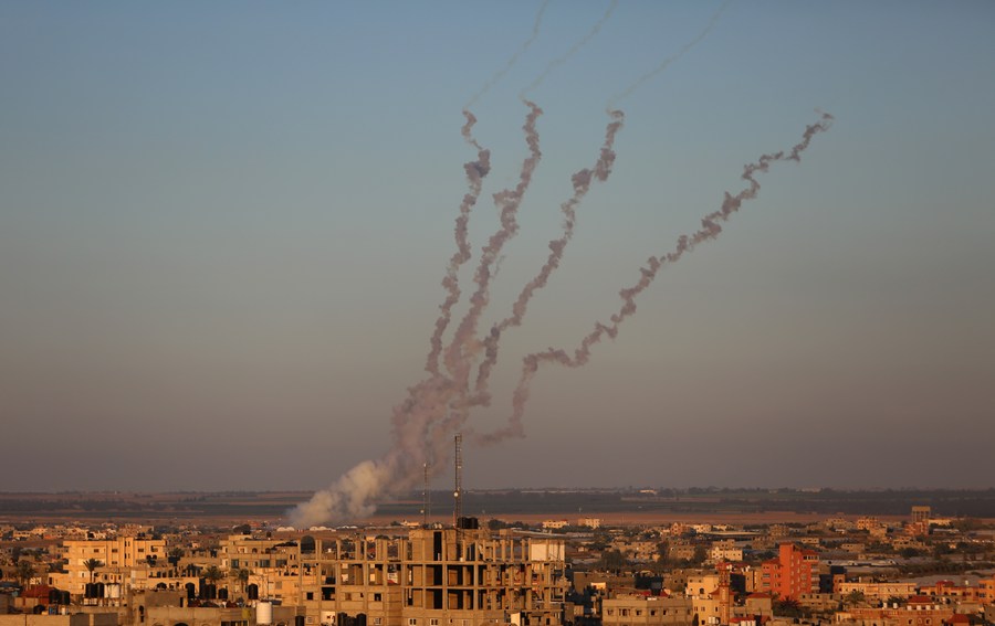 Photo taken on May 15, 2021 shows rockets being fired towards Israel from the southern Gaza Strip city of Rafah. (Photo by Khaled Omar/Xinhua)