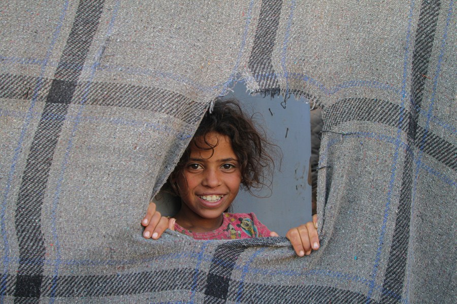 A child looks out through a hole in a blanket at her house al-Zaitoun neighborhood one of the poorest areas in Gaza City, on Dec. 2, 2021. (Photo by Rizek Abdeljawad/Xinhua)