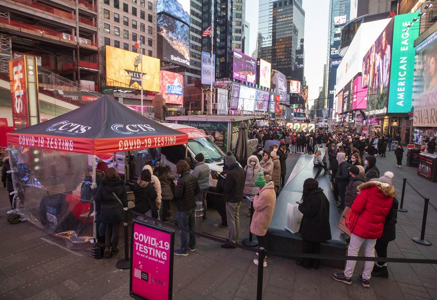 People wait in line for COVID-19 tests at a mobile testing site on Times Square in New York, the United States, Dec. 20, 2021. (Xinhua/Wang Ying)