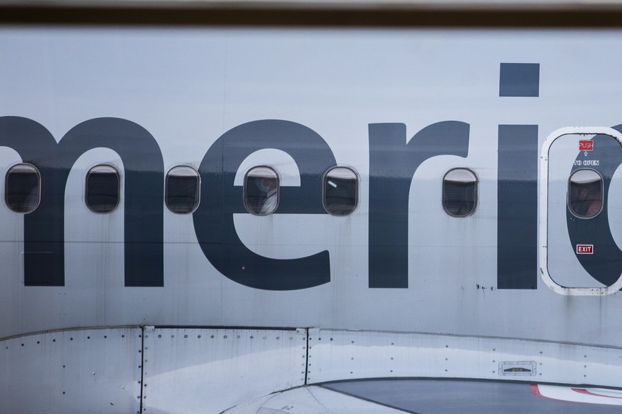 A passenger wearing a face mask is seen in a plane at Ronald Reagan Washington National Airport in Arlington, Virginia, the United States, Dec. 4, 2021. (Photo by Aaron Schwartz/Xinhua)
