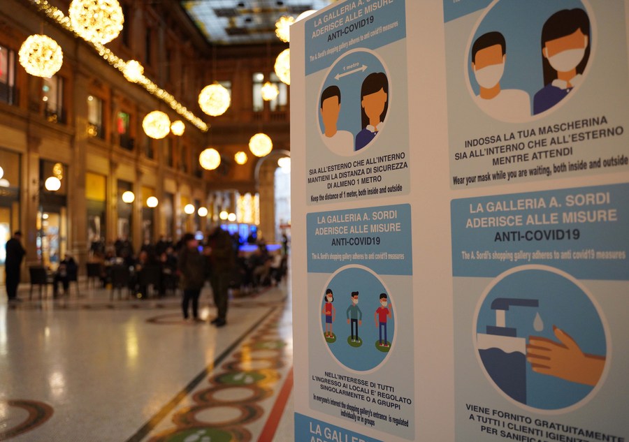 A COVID-19 notice board is seen at Galleria Alberto Sordi in Rome, Italy, Dec. 24, 2021. (Xinhua/Jin Mamengni)