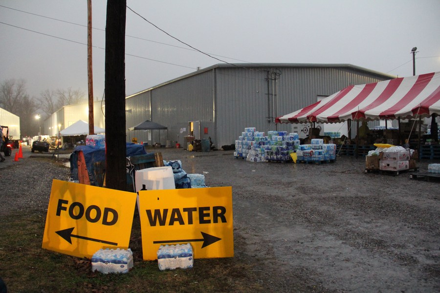 Signposts are seen at the Groves County Football Stadium in the outskirt of Mayfield, Kentucky, the United States, Dec. 17, 2021. The stadium is now a relief materials distribution center for tornado victims nearby. (Photo by Angie Yu/Xinhua)