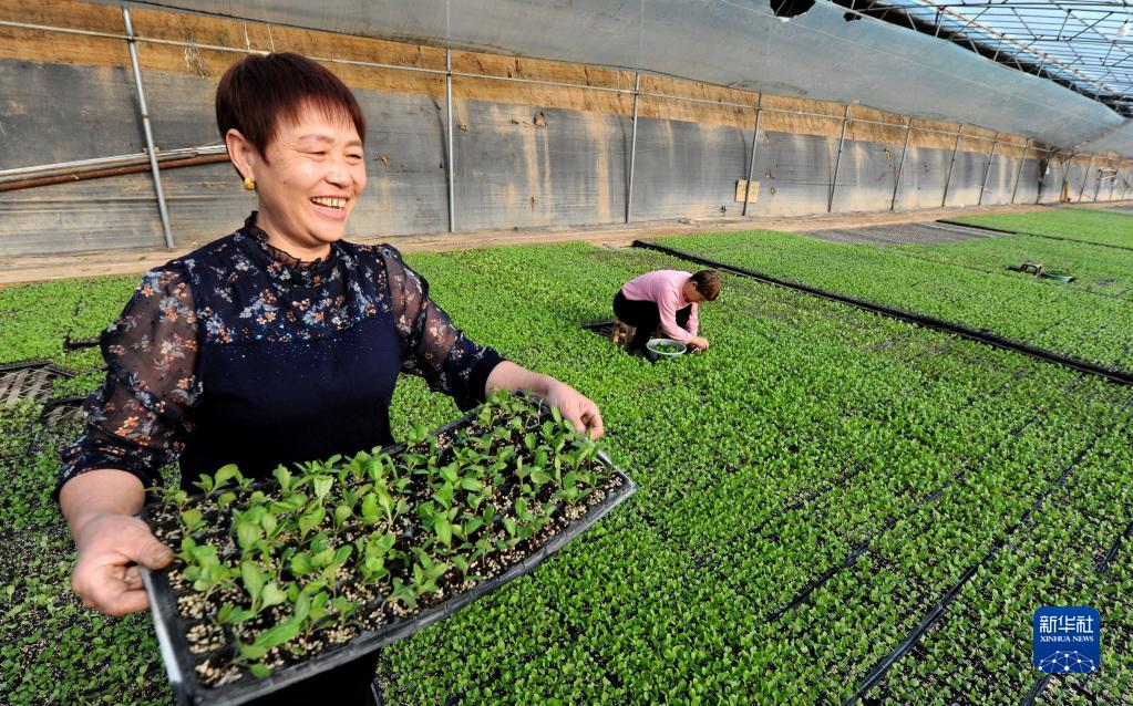 Photo taken on Dec. 29, 2021 shows farmers working in a greenhouse for vegetable seedling cultivation in Nanshang Village, Zhaiwang Township, Yangxin County, east China’s Shandong Province. In recent years, the local government has been helping farmers increase their income by facilitating organic vegetable planting and establishing organic fertilizer production bases. Now the business has been scaled up and industrialized.