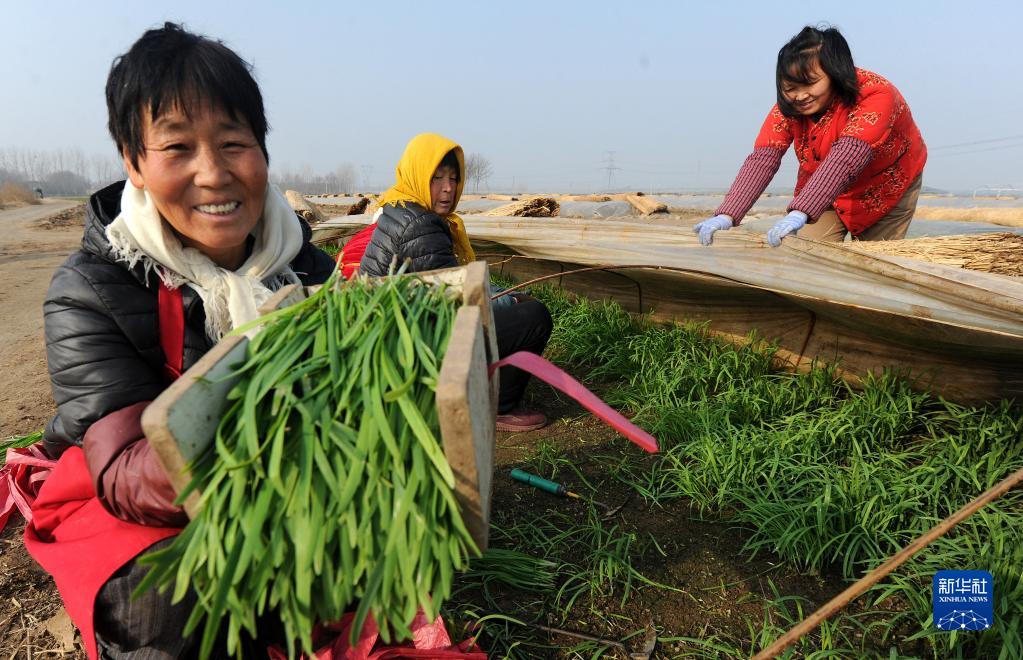 Photo taken on Dec. 29, 2021 shows farmers harvesting Chinese chives at an organic produce cooperative in Nanchen Village, Zhaiwang Township, Yangxin County, east China’s Shandong Province. In recent years, the local government has been helpingfarmers increase their income by facilitating organic vegetable planting and establishing organic fertilizer production bases. Now the business has been scaled up and industrialized.