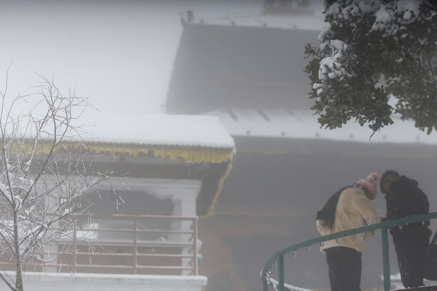 People are seen in snowfall on Chandragiri Hill inside the Kathmandu Valley, Nepal, on Dec. 29, 2021. (Photo by Sulav Shrestha/Xinhua)