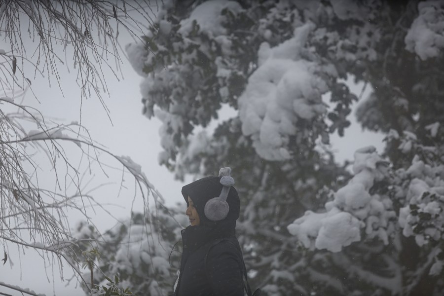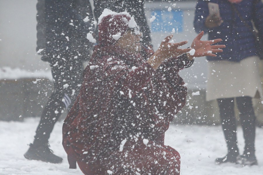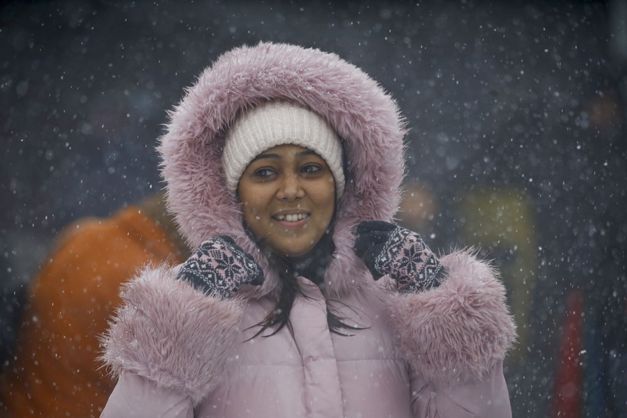 A girl is having fun in snowfall on Chandragiri Hill inside the Kathmandu Valley, Nepal, on Dec. 29, 2021. (Photo by Sulav Shrestha/Xinhua) ■