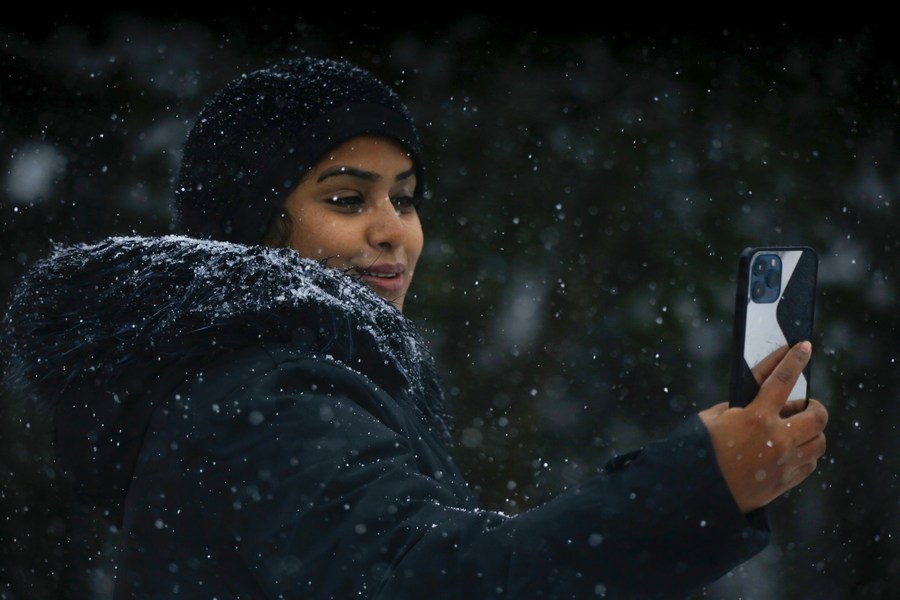 A girl is taking a selfie in snowfall on Chandragiri Hill inside the Kathmandu Valley, Nepal, on Dec. 29, 2021. (Photo by Sulav Shrestha/Xinhua)