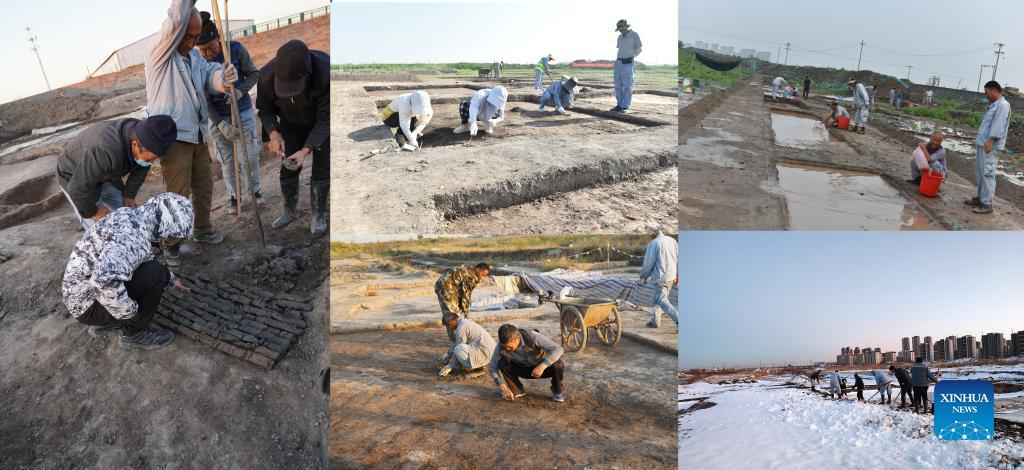 Combined photo shows archaeological staff working at Junliangcheng site in north China's Tianjin Municipality. (Xinhua)