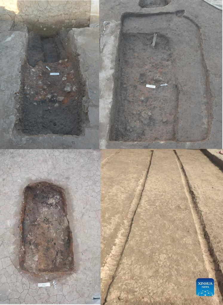 Combined photo shows ancient pits and ovens for salt making and tracks of wheels found at the ruins of a salt-making workshop dating back to the Tang Dynasty (618-907) at Junliangcheng site in north China's Tianjin Municipality. (Xinhua)