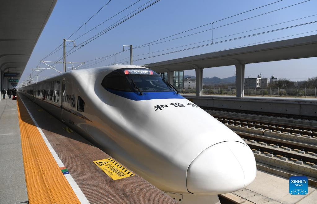 A train of the Anqing-Jiujiang high-speed railway is seen pulling into the Huangmei East Railway Station in Huangmei County, central China's Hubei Province, Dec. 30, 2021. A new high-speed railway section linking Anqing City in east China's Anhui Province, with Jiujiang City in east China's Jiangxi Province began operation Thursday. The 176-km line, with seven stations along its route, will reduce travel time between Anhui's capital Hefei and Jiangxi's capital Nanchang to two hours and 22 minutes, according to China Railway Shanghai Group Co., Ltd. The Anqing-Jiujiang high-speed railway has a designed speed of 350 km per hour and is connected to China's vertical artery of the Beijing-Hong Kong Railway. (Xinhua/Xiao Yijiu)