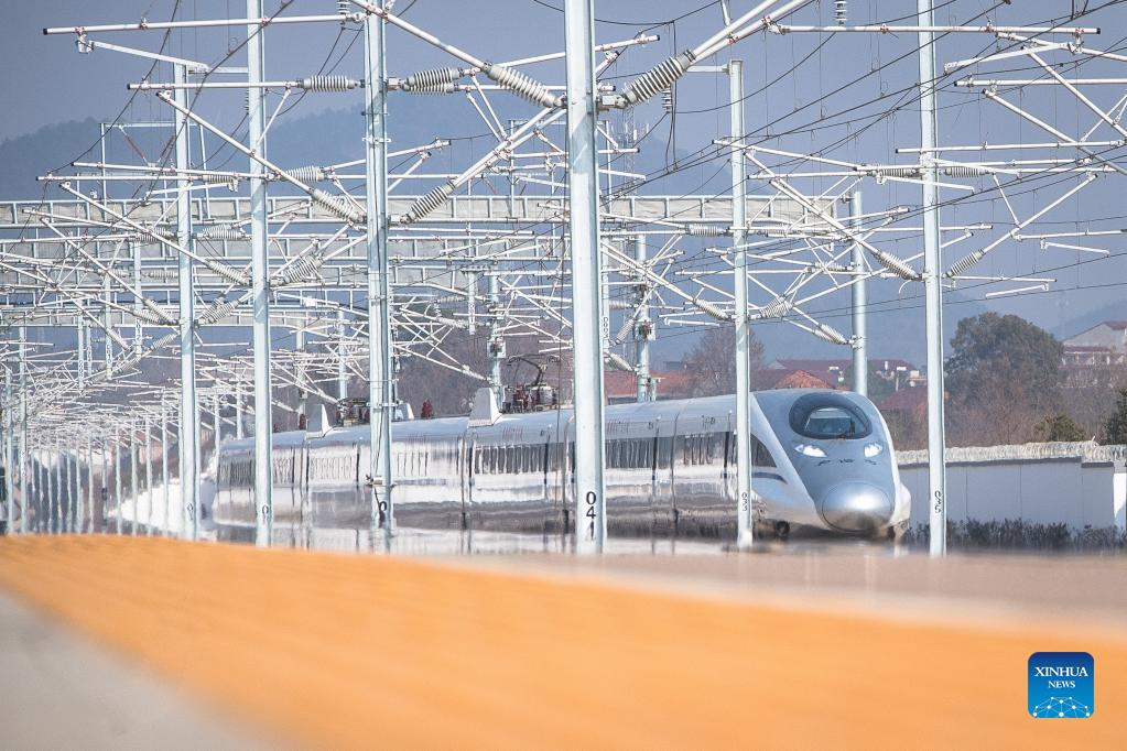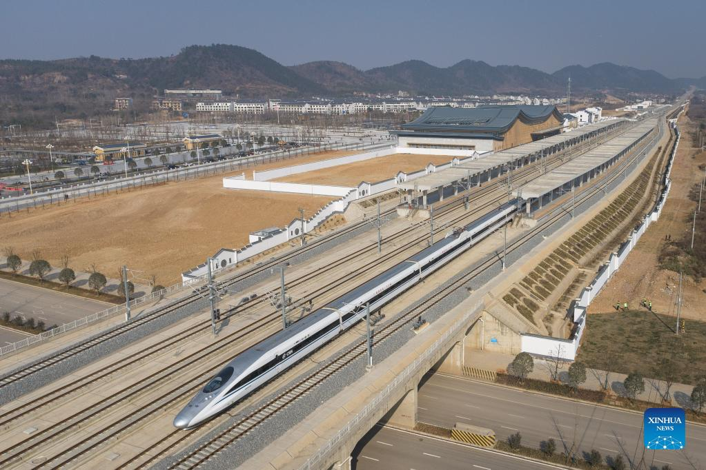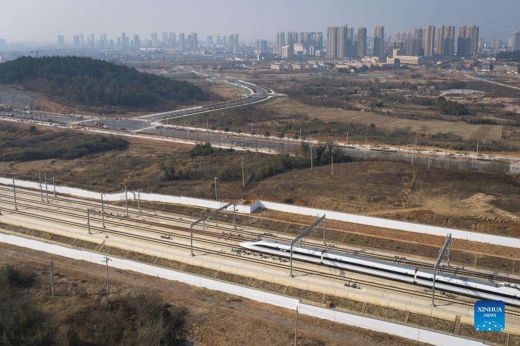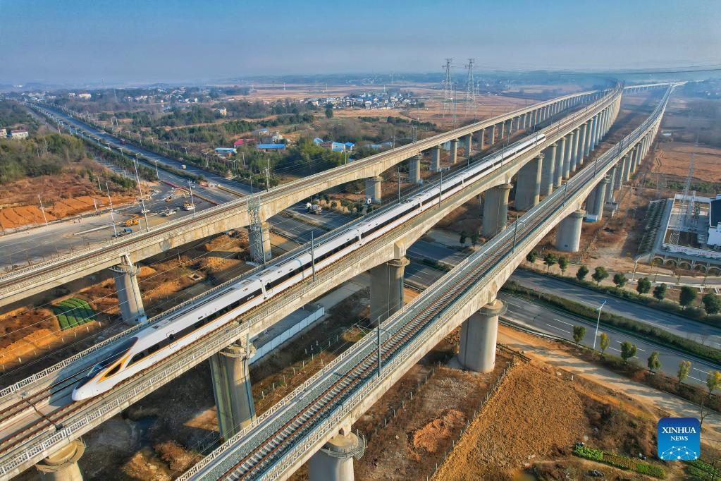 A train runs along the Anqing-Jiujiang high-speed railway in Susong County, east China's Anhui Province, Dec. 30, 2021. A new high-speed railway section linking Anqing City in east China's Anhui Province, with Jiujiang City in east China's Jiangxi Province began operation Thursday. The 176-km line, with seven stations along its route, will reduce travel time between Anhui's capital Hefei and Jiangxi's capital Nanchang to two hours and 22 minutes, according to China Railway Shanghai Group Co., Ltd. The Anqing-Jiujiang high-speed railway has a designed speed of 350 km per hour and is connected to China's vertical artery of the Beijing-Hong Kong Railway. (Photo by Lyu Jinyi/Xinhua)