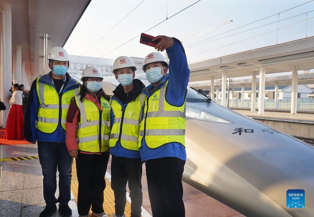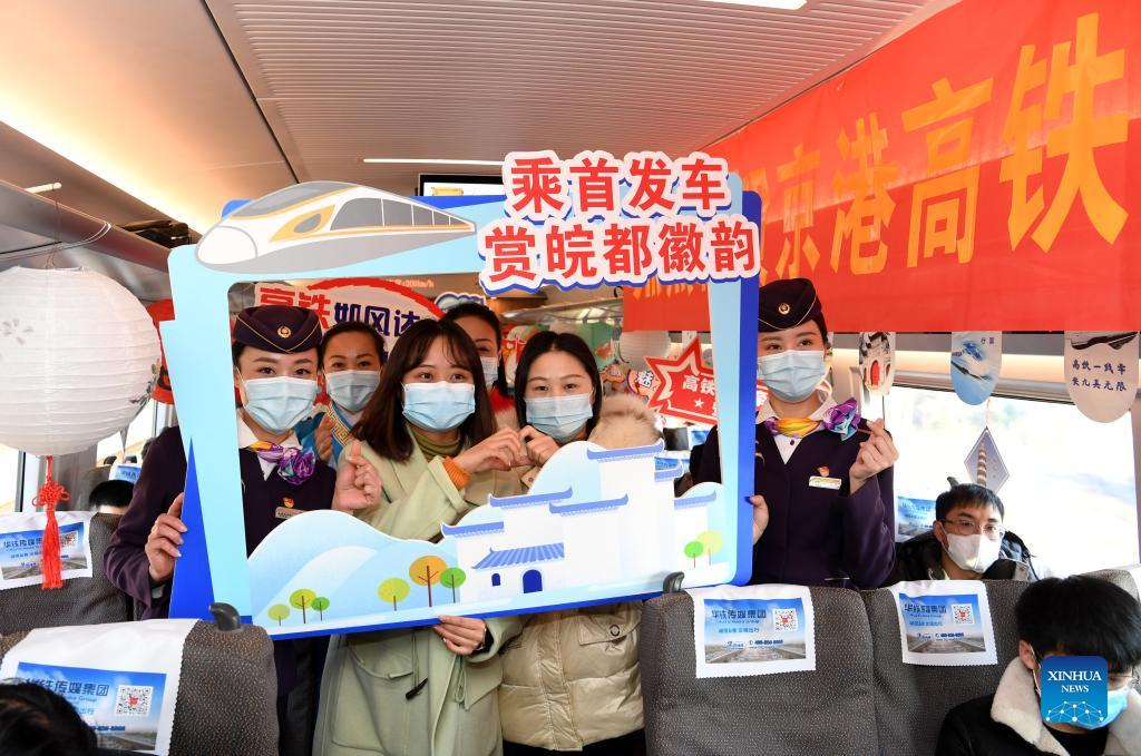 Crew members and passengers pose for a photo on a high-speed railway train running from Hefei in east China's Anhui Province to Shenzhen in south China's Guangdong Province, Dec. 30, 2021. A new high-speed railway section linking Anqing City in east China's Anhui Province, with Jiujiang City in east China's Jiangxi Province began operation Thursday. The 176-km line, with seven stations along its route, will reduce travel time between Anhui's capital Hefei and Jiangxi's capital Nanchang to two hours and 22 minutes, according to China Railway Shanghai Group Co., Ltd. The Anqing-Jiujiang high-speed railway has a designed speed of 350 km per hour and is connected to China's vertical artery of the Beijing-Hong Kong Railway. (Xinhua/Liu Junxi)